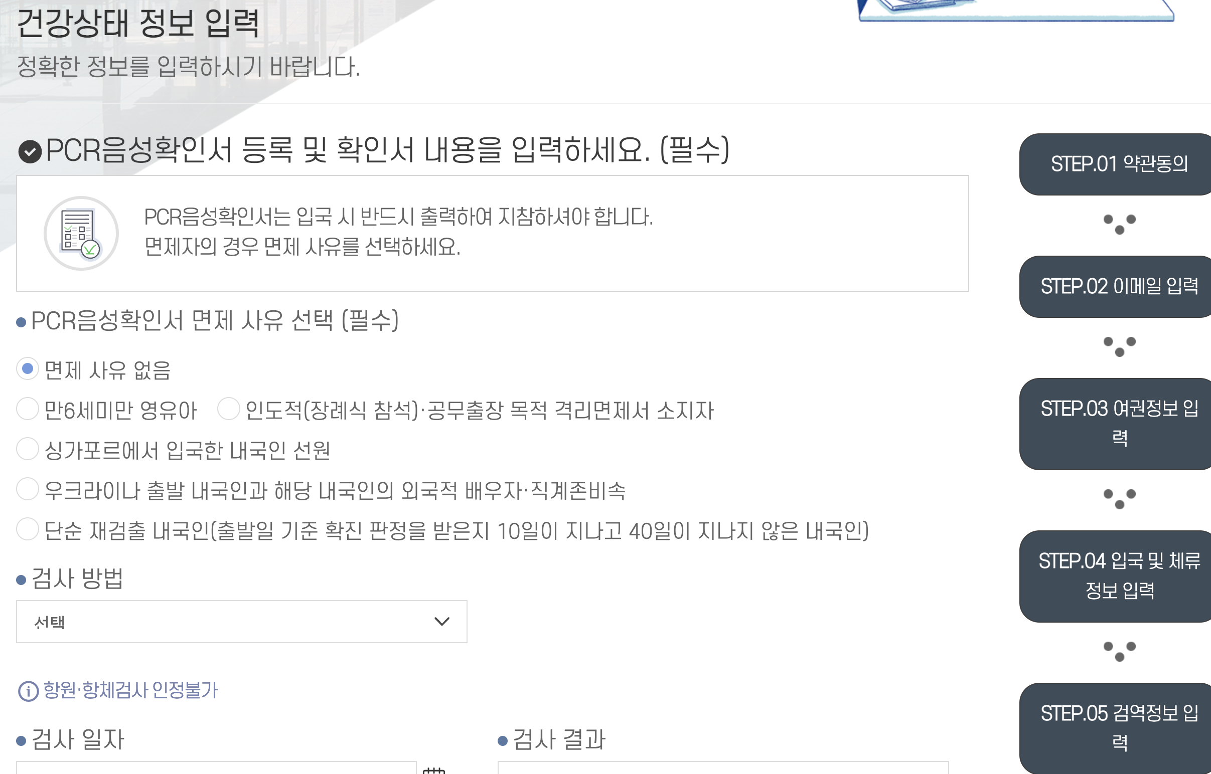 미리 입력하려고 할 시 위 부분에서 PCR 음성 증명서가 없어서 멈추게 되는데 여기서 종료해도 다음에 입력할 때 이 전의 입력한 내용을 불러와 주니 여기까지만 입력해 두는 것도 한 가지 방법입니다. PCR 음성 증명서가 있으신 분은 계속 안내에 따라 진행하시면 됩니다. 백신 이력 첨부나 음성 증명서 첨부가 조금 귀찮긴 하지만 등록은 어렵지 않습니다. 한 5분도 안돼서 입력할 수 있던 것 같네요.