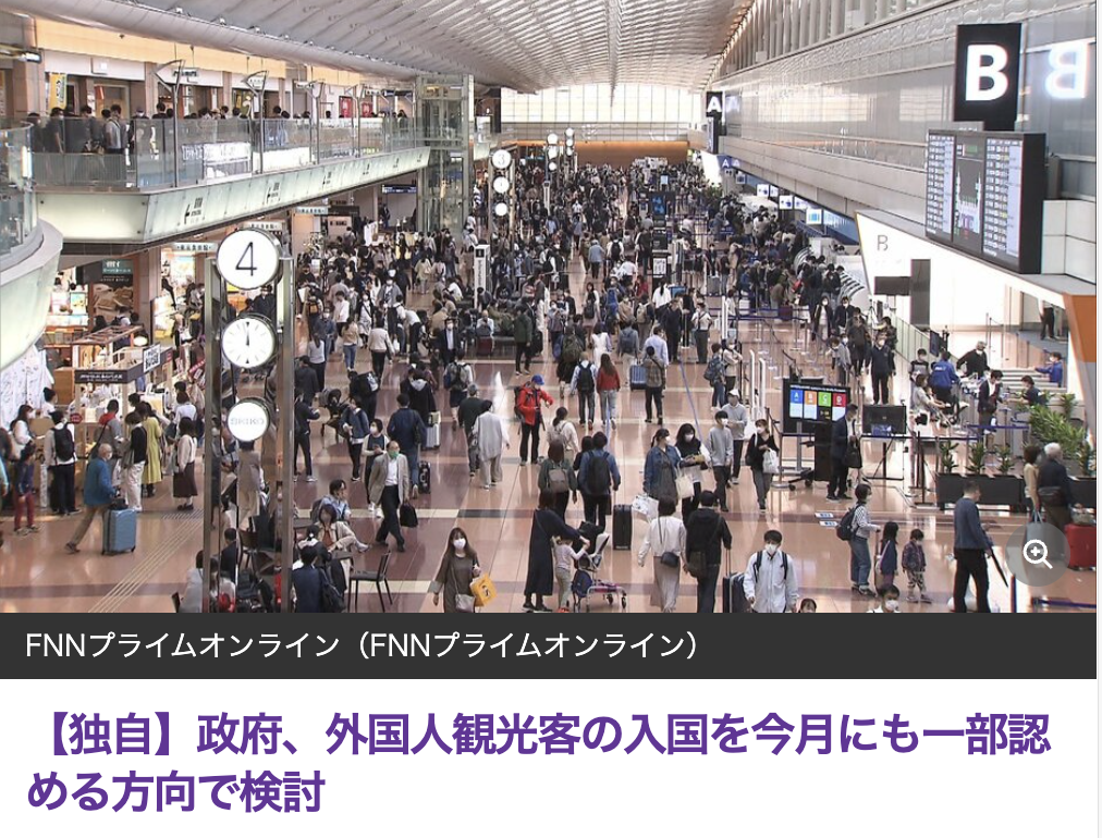 드디어 일본 정부가 외국인 관광객의 입국을 확대해 나가는 방안을 검토하고 있다고 합니다. 기존의 6월 이후 단계적으로 확대하겠다는 방안에 더하여 빠르면 이번달 중에도 일부 허용할 수 있다고 합니다. 이르면 5월 중 소규모 인원 투어에 한정하여 인정하는 방향으로 검토하고 있다고 합니다. 정부 관계자에 의하면 "백신 3차 접종을 끝내고 있는 외국인"을 대상으로 여정이 미리 정해진 소수의 투어 참가자에 대하여 시험적으로 관광 목적의 입국을 인정하는 방향으로 검토 중이라고 합니다. 감염 상황을 판별하며 감염 확대가 억제되면 다음 달 이후로 단계적으로 확대해 나갈 것이라고 합니다.