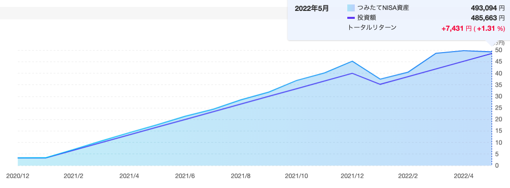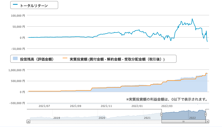 위의 사진에서 보라색 선이 총 투자액, 파란 선이 총자산을 나타내는데요. 18개월 차인 2022년 5월 현재는 간신히 +1.3%를 유지하고 있습니다. 한때 +10% 넘는 수익을 나타냈었는데 어느덧 +1.3%로 많이 줄은 모습이네요.