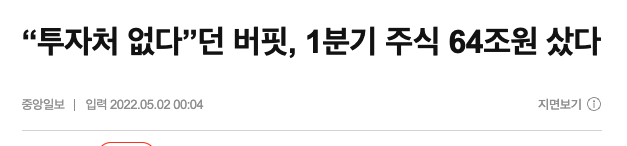 제가 가장 많은 영향을 받고 있는 투자가는 아마도 많은 사람들이 그렇듯 워런 버핏입니다. 최근 워렌 버핏이 매수를 시작하였고, 현재는 주가가 더 하락하여 버핏보다도 저렴한 가격에 매수할 수 있다니 마치 본인이 버핏보다 능력 좋은 가치투자자가 된듯한 느낌이 듭니다. 그냥 흔하디 흔한 '주린이'이지만요...