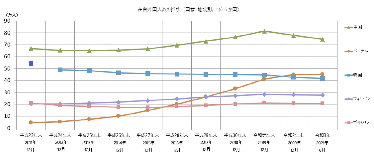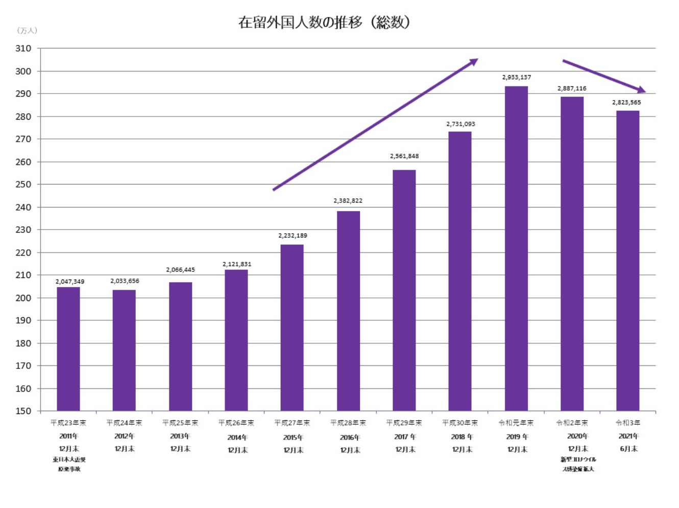 2021년 6월 말 출입국 재류 관리청의 발표에 따르면 일본에 거주하는 외국인은 282만 3,565명으로 일본 총인구의 약 2%를 차지하고 있다고 합니다. 매년 증가 추세에 있던 외국인 추이는 2020년 코로나의 영향으로 신규 입국이 폐쇄되며 증가세가 감소한 것이 보이네요.