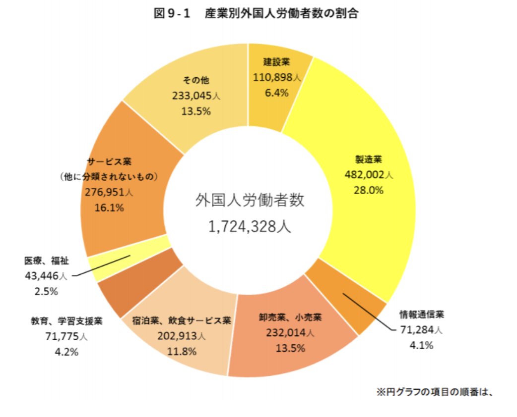 일본 거주 외국인 노동자 수의 비율을 보면 위와 같습니다. 1위는 28.0%로 제조업 종사자가 가장 많았고 그 뒤를 이어 서비스업이 16.1%로 2위, 그리고 같은 13.5%로 '그 외'와 판매업이 뒤를 이었습니다. 제가 속한 정보 통신업 종사자는 4.1%밖에 되지 않네요. 제 주변 외국인들이 모두 정보 통신업에 종사하고 있어서 이 비율이 제법 높을 것이라 생각했는데 외국인이 아주 적은 산업이었네요.