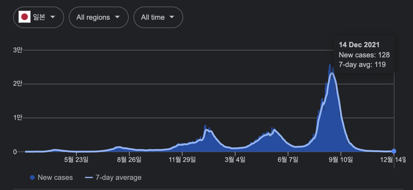 그러다가 일본의 총리가 바뀌기 얼마 전인 9월 중순부터 가파르게 감염자 수가 내려와서 10월 기시다 총리가 취임할 때쯤 취임 선물이라도 주듯 아주 낮은 코로나 감염자 수를 기록하였다. 이때부터는 일본도 위드 코로나로 전환하며 외국인의 입국을 허가하고 영업 제한을 풀어주는 등 여름과 비교해서는 상당히 완화적 정책을 시행했던 것 같다. 최근 오미크론 변이가 발생하며 일본은 모든 외국인뿐만 아니라 심지어는 자국민에 대한 재입국까지 제한하였는데 (자국민에 대한 제한은 발표 며칠 후 해제되었다.) 아무래도 최근 진정된 자국의 코로나 상황 때문에 유독 강한 제한을 걸었다고 보인다.