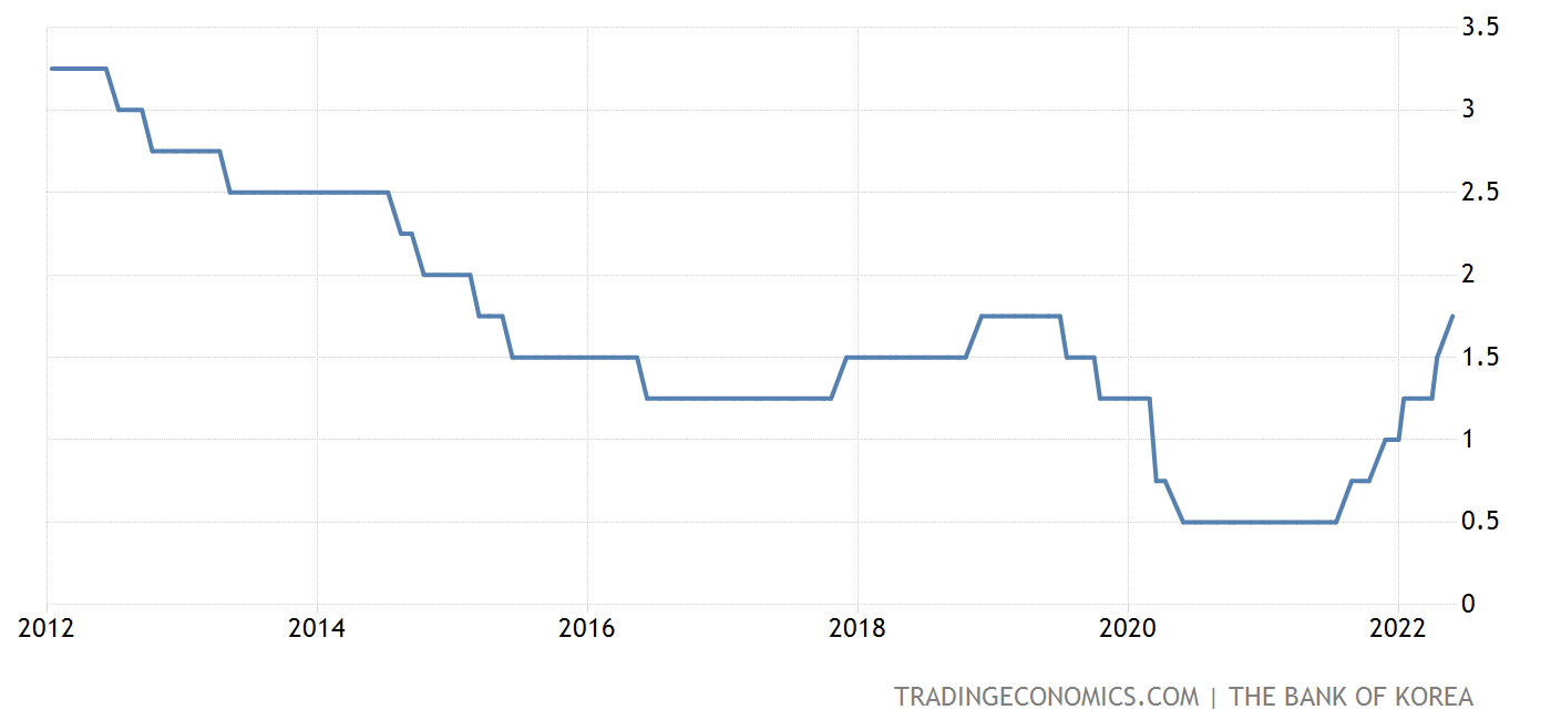 한국은 코로나로 인해 0.5% 까지 인하했던 금리를 인상하기 시작하여 현재는 1.75%까지 인상하였습니다. 금리를 인상하면 일반적으로 경제 활동을 위축시키는 효과를 갖고 있습니다. 은행의 예금, 대출의 경우를 보면 금리가 상승하며 대출을 덜 받게되고 더 저축하려고 하게 됩니다. 그 결과 투자와 소비가 줄어들며 경제활동이 둔화되고 물가가 하락하게 됩니다. 코로나의 영향으로 금리를 낮추고 돈을 더 많이 찍어낸 결과 인플레이션이 생기게 되었고 세계는 이 인플레이션을 잡기 위해 금리를 높이고 있는 상황입니다.