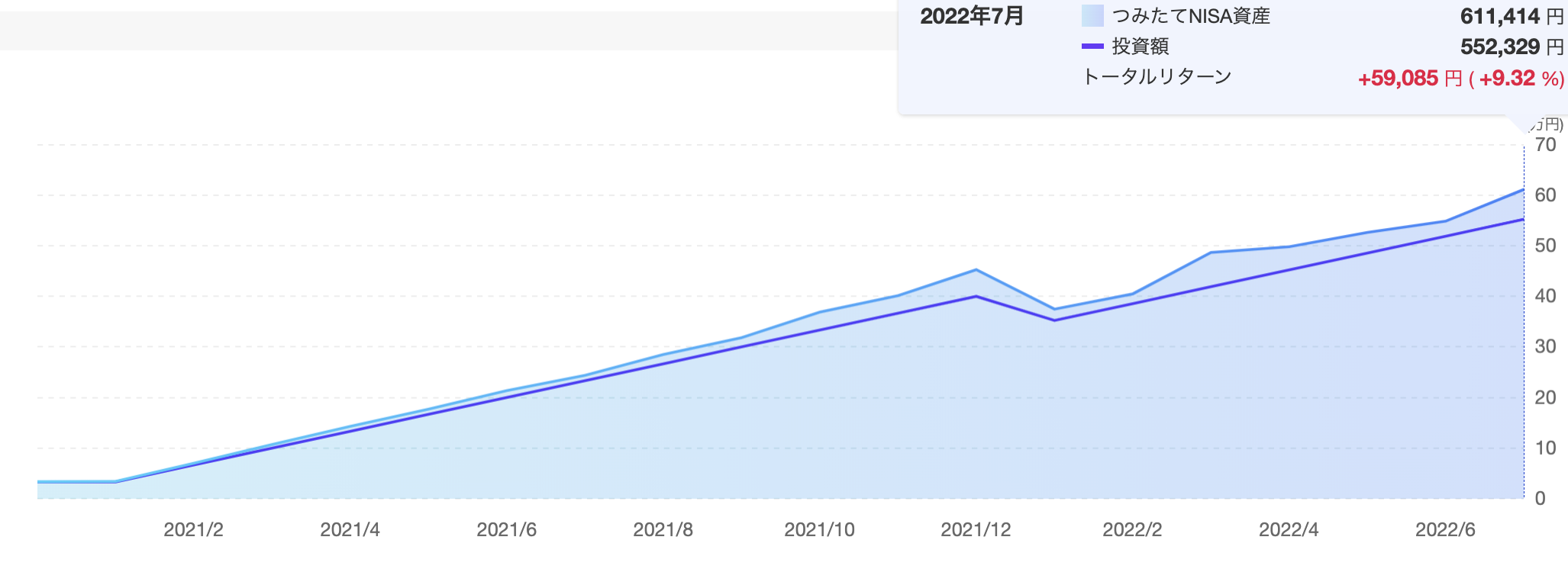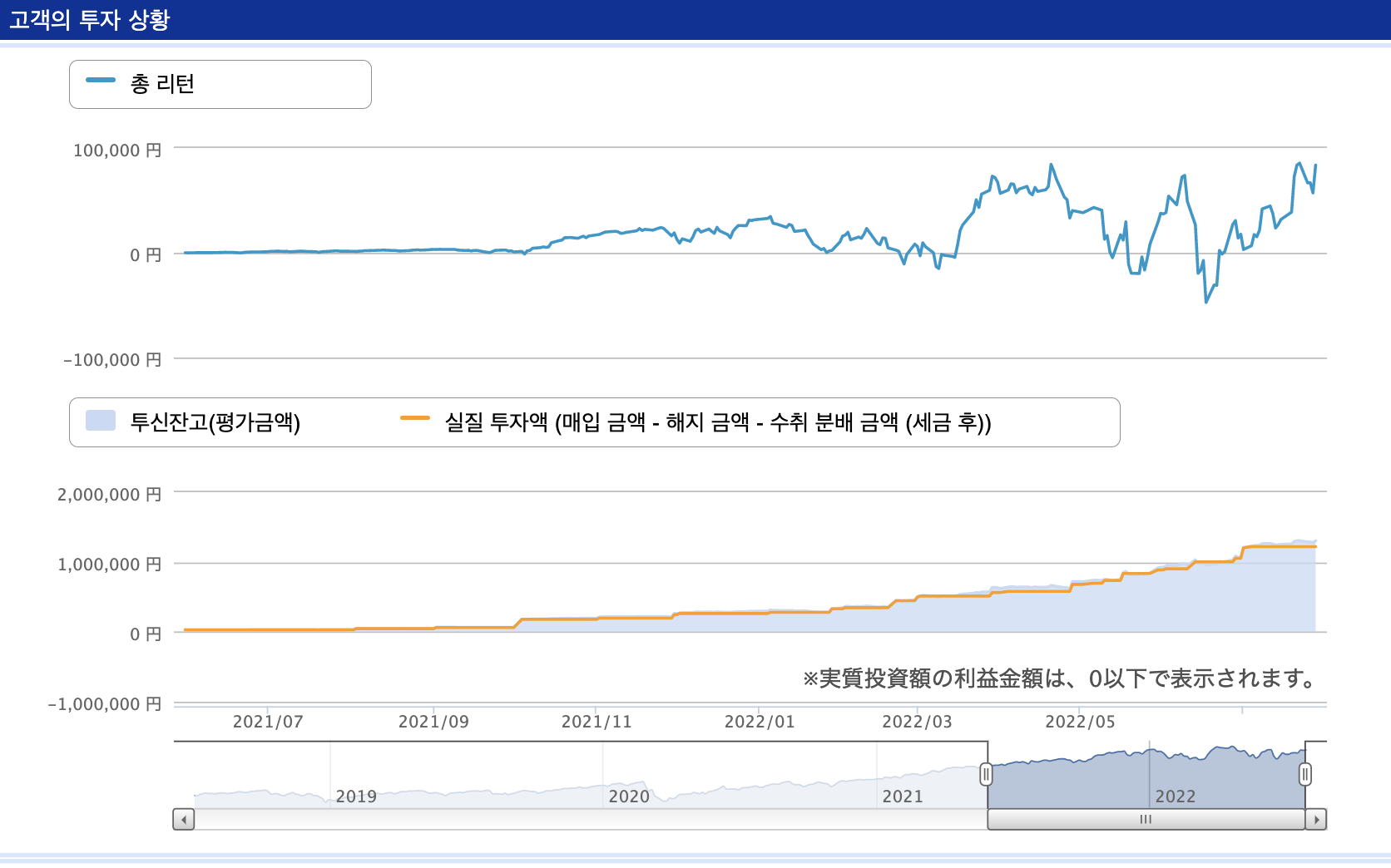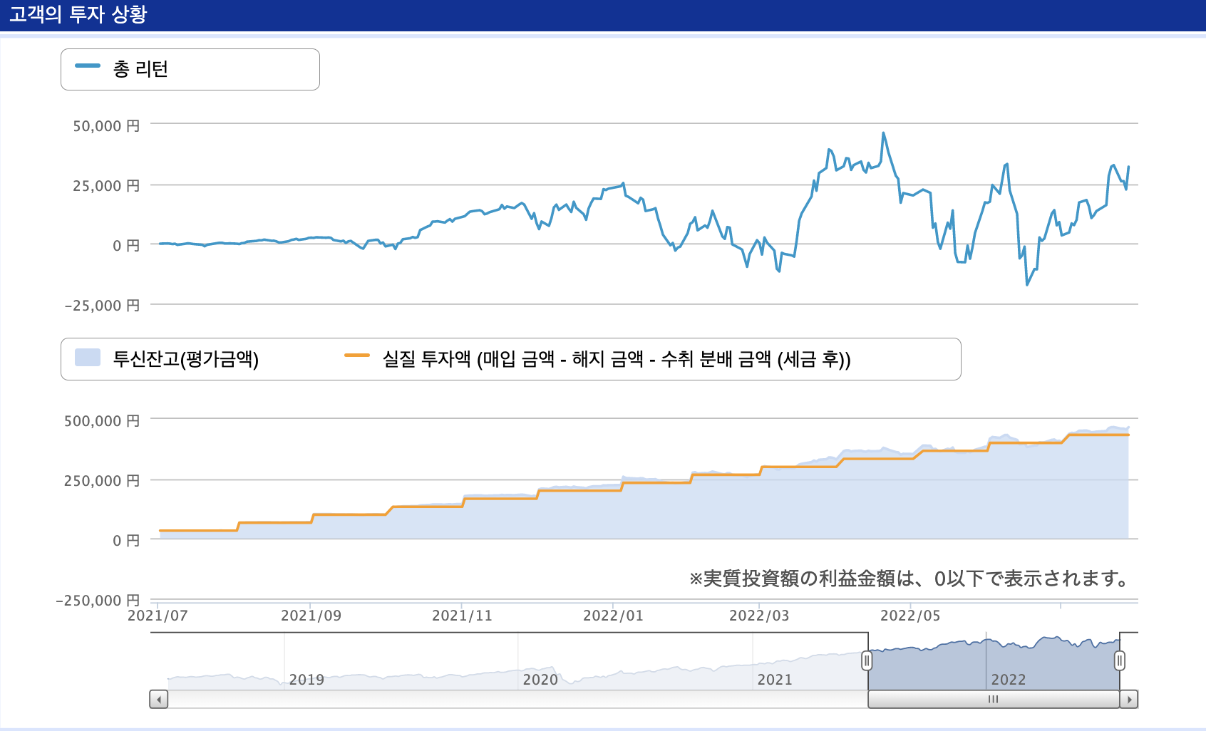 22년 상반기에 총리턴이 거의 5만 엔 가까이 올라오던 시기가 있었는데 어느새 마이너스가 되더니 다시 또 상승하여 25,000엔을 넘겼습니다. 베어마켓에서도 10% 가까운 수익을 보여주고 있는 것은 분명 적립식 매수의 힘인 것 같습니다.