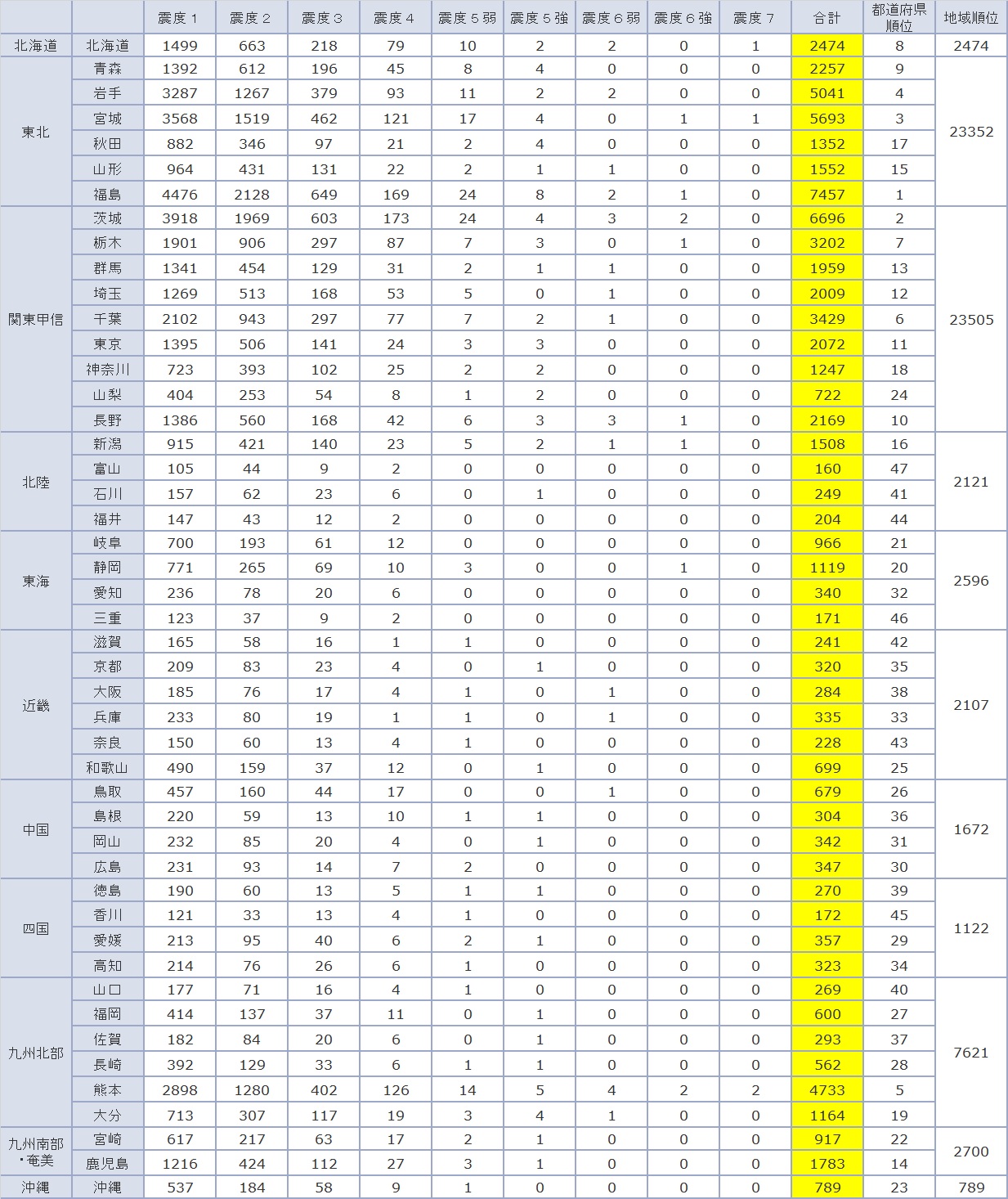 도도부현별 지진 발생 빈도