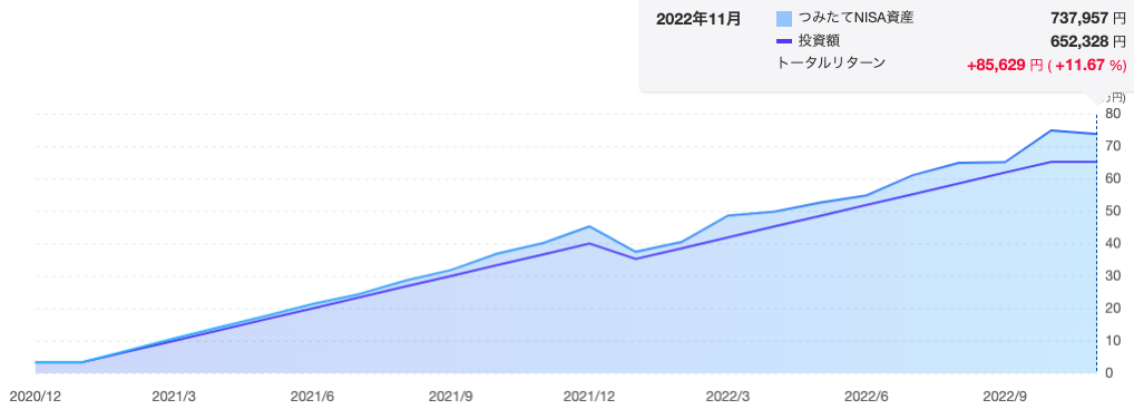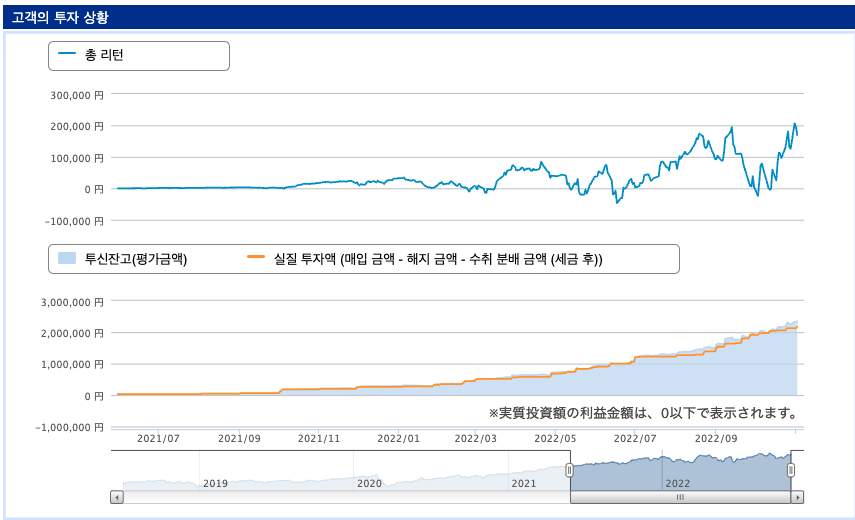 다음으로는 일반 적립 매수 계좌 현황입니다. 매달 7.7만 엔씩 적립 매수하고 있고 주가 하락이 심할 때마다 추가적으로 매수해 주고 있는 계좌입니다. 지난 10월에는 특히 많은 자산을 매수했었습니다. 아래의 그래프에서 실질 투자액을 나타내는 주황색 선을 보면 투자액이 잘 늘지 않던 2021년에 비해 2022년은 훨씬 가파른 증가를 보여주고 있습니다.