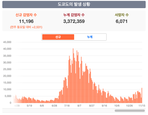 도쿄 도는 1만 1196명의 하루 신규 감염자 수가 보고되었습니다. 누적 감염자 수가 337만 명이라니 도쿄 인구가 1400만 명 정도인데 1/5 조금 안 되는 인구가 감염되었네요. 위의 사진에서 보듯 그래프 상으로도 코로나 감염자 수의 증가가 나타나고 있습니다.