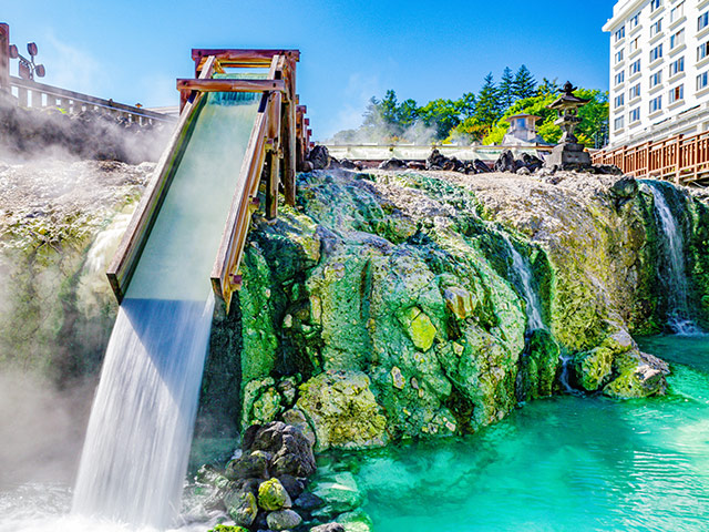 쿠사츠 온천은 매 분 3만 2300리터 이상의 자연 용출량을 구성하고 있습니다. 강한 산성이고 온도가 높은 것이 특징입니다.