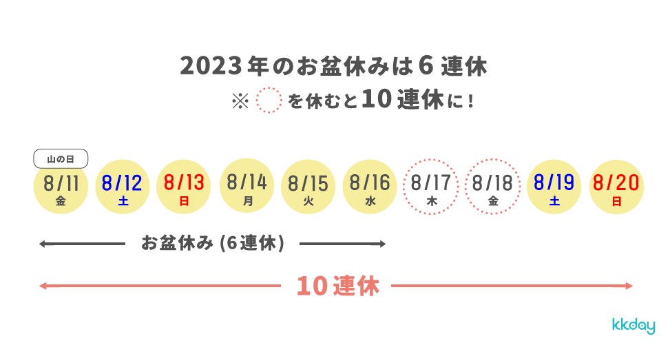2023년의 오봉은 8월 11일(금)의 산의 날이 주말에 접해 있기 때문에 6 연휴가 됩니다. 6 연휴만으로도 상당히 긴 휴가인데요. 여기서 8월 13일~8월 16일 이외에 17일, 18일의 2일에 휴가를 갖게 되면최장 10 연휴를 가질 수 있습니다.