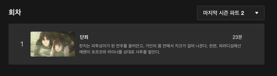 다행히도 '진격의 거인 파이널 시즌 파트 2'는 사전 공급계약을 통해 넷플릭스에서도 시청이 가능하다고 합니다. 지금 확인해보니 오늘 새벽에 방영한 영상이 넷플릭스에도 마지막 시즌 파트 2에 올라와있네요. 혹시나 월요일 생방송을 놓치더라도 넷플릭스를 이용해 더욱 간편하게 볼 수 있을 것 같습니다.