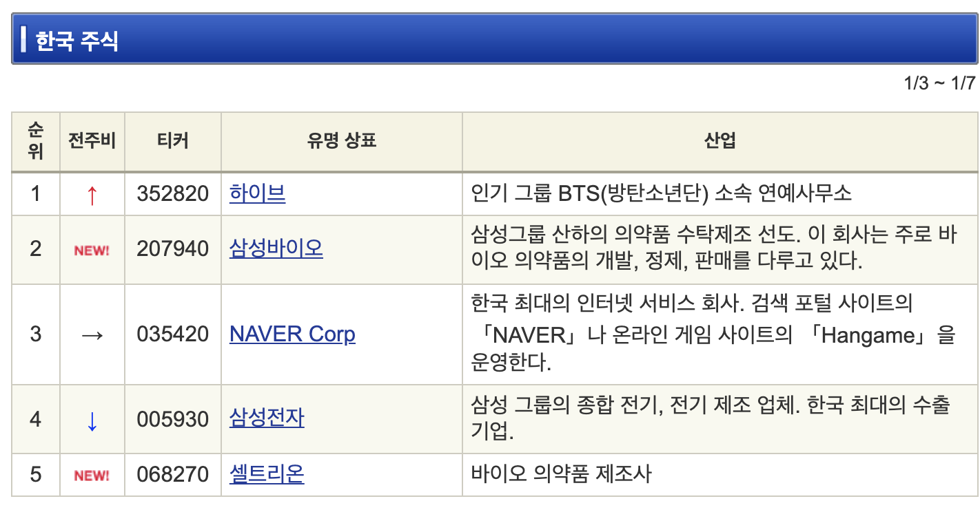 일본 투자자들의 국내 주식 투자 랭킹 (1/3 ~ 1/7일 기준)