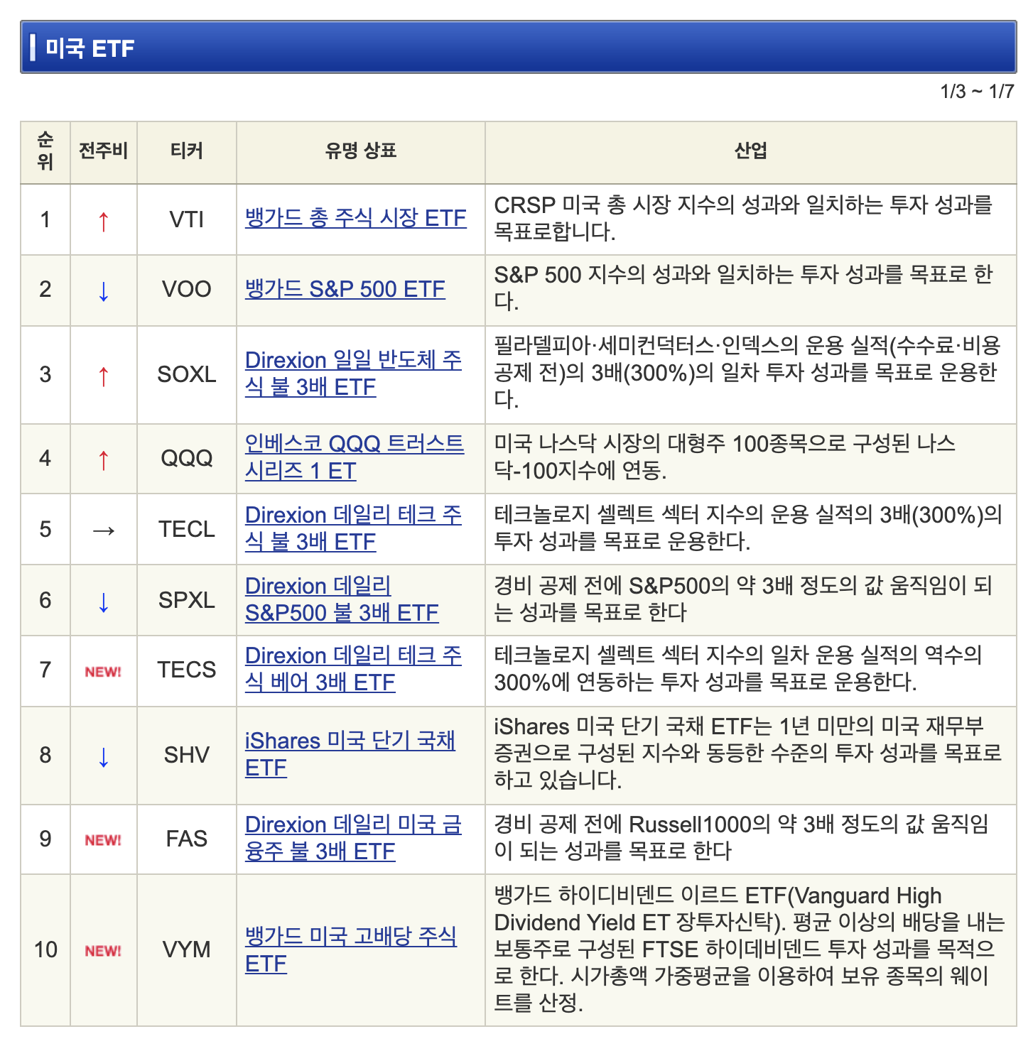 1위인 VTI는 뱅가드사에서 운용하는 VTI는 미국 전체 시장 지수를 추종합니다.