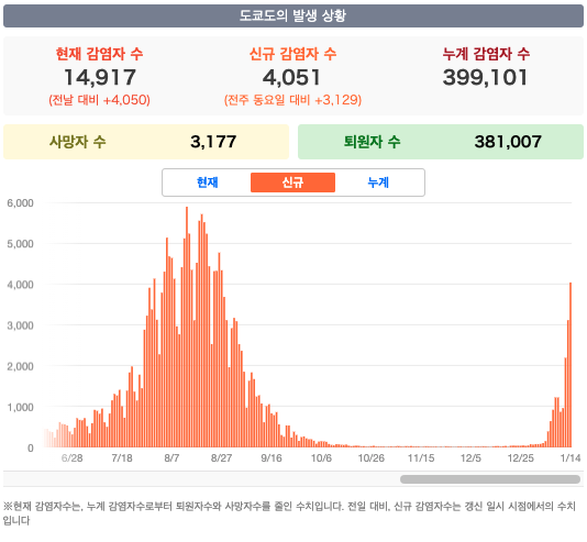 1월 14일 일본 전국에서 확인된 신형 코로나 바이러스의 감염자는 2만2045명으로 집계되어 약 4개월 반 만에 2만 명을 넘었다고 합니다. 연말연시의 긴 연휴를 시작으로 많은 이벤트들이 있었는데 그 영향이 크지 않나 싶습니다. 작년 여름에 무섭게 증가하던 코로나 확진자수보다도 훨씬 가파른 추세로 증가하고 있음을 알 수 있습니다. 한동안 급감한 코로나 확진자 수 덕분에 이곳저곳 놀러 다니기도 했었는데 또다시 도쿄에 제한 조치가 시행될까 벌써부터 겁이 나네요.
