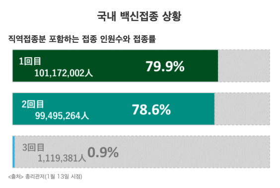 이러한 감염 확대에도 불구하고 일본 백신 접종률은 1차 79.9%, 2차 78.6%, 그리고 3차 접종은 0.9%로 3차 접종은 아직 시작 단계입니다. 현재 3차 백신 접종은 우선 접종 대상인 의료 종사자와 고령자가 주로 맞고 있지만 이를 곧 일반인에 대해서도 접종을 앞당기겠다고 합니다. 12월 17일부터 의료 종사자 등을 대상으로 3차 백신 접종을 시작했지만 한 달이 지난 1월에도 여전히 백신 3차 접종률이 0.9%밖에 되지 않고 있네요. 언제나 되어야 일반인들도 3회 접종을 시작할 수 있을지 감도 잡히지 않네요...