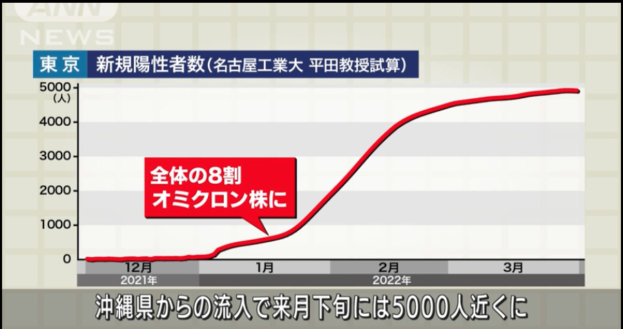 또한 ANN 뉴스에 공개된 자료에 의하면 오미크론의 감염력이 높아 추이상으로는 2월 말의 도쿄에는 매일 5천 명 이상의 신규 양성 확진자가 나올 것이라는 예상도 나오고 있습니다. 영미권과 비교하여 비교적 잘 방어하고 있다고 생각했는데 이렇게 한 순간에 폭증하다니 오미크론의 감염력이 상당한 것 같습니다.
