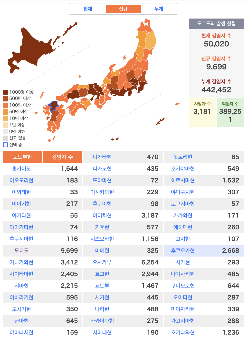 일본 신규 코로나 확진자 5만 명 육박, 도쿄 확진자는 1만 명 육박