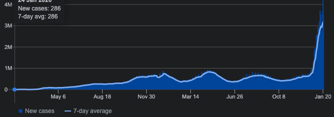 아래의 그래프처럼 전세계적으로 봐도 이번 오미크론 변이로 확진자가 급격하게 증가하는 것을 알 수 있는데요. 하루빨리 백신과 치료제가 공급되길 바랍니다.