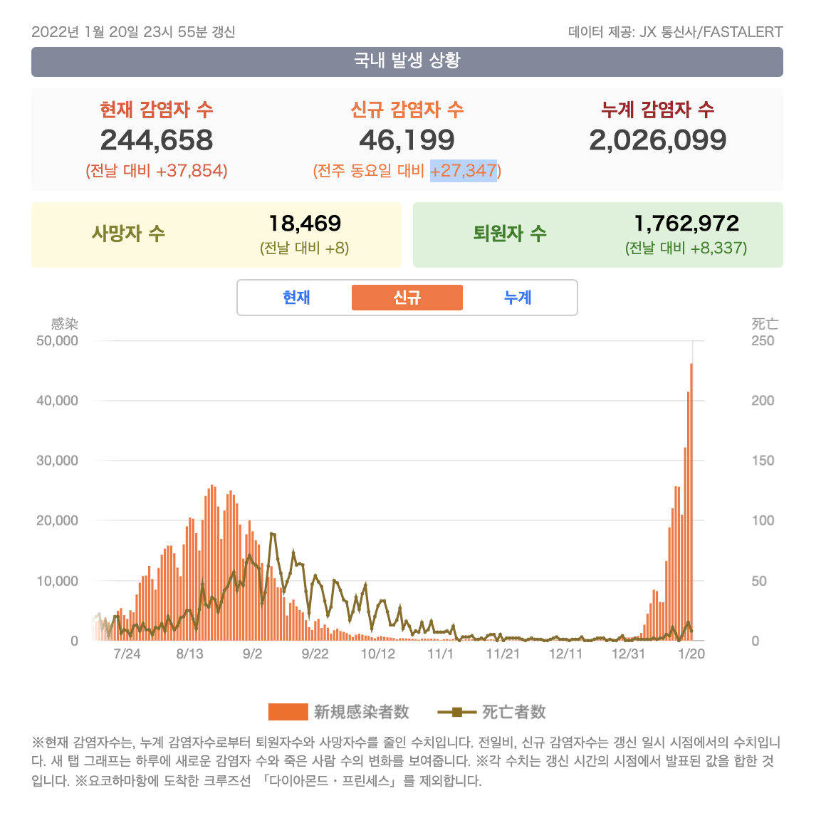 2022년을 시작으로 늘어나던 코로나 확진자 수가 지난번 포스팅에서 '2월 말부터는 매일 도쿄에서 5천 명의 확진자가 나올 것으로 보인다'라고 했던 전문가의 예상 보다도 훨씬 더 빠른 속도로 늘어나고 있습니다. 오늘 일본 확진자는 46,199 명으로 저번 주 같은 요일 대비 27,347명이 늘었으며, 도쿄 역시 9699명으로 1만 명에 육박하고 있습니다. 저번 달인 12월 16일 경 ([일본 일상] 왜인지 코로나가 사라진 일본에서의 일상, 현지에서의 느낌.)을 작성 할 때만 해도 매일 일본 전국에서 대략 100명대의 코로나 확진자가 나왔던 것에서 시작해 대략 한 달 뒤인 지난번 1월 15일에 작성한 (일본 하루 코로나 확진자 2만 명 돌파)에서 2만 명, 그리고 오늘 1월 22일 기준 46,199명인 것을 미루어 보면 적은 기간에 상당한 속도로 확산하고 있음을 알 수 있습니다.