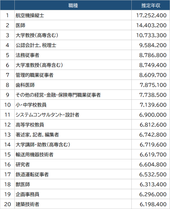 1위는 항공기 조종사(파일럿)으로 1725만 엔이었습니다.이어서 의사 1440만 엔, 대학교수 1073만 엔으로 1~3위가 연봉 1000만 엔 이상이네요. 이 후생노동성 조사 자료에서는 의사의 평균 연수입에 독립 개업한 의사는 포함되어 있지 않다고 하니 실제론 더 높을 것으로 생각됩니다.