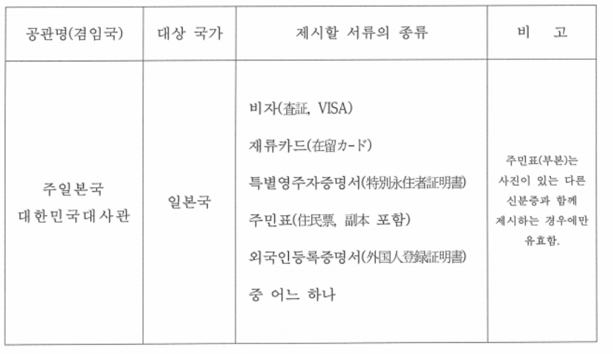 일본 재외국민 투표 지참물로는 비자 혹은 재류카드, 여권, 주민등록증, 공무원증, 운전면허증, 특별 영주자 증명서 주민표, 외국인등록 증명서 중 어느 하나가 필요합니다.
