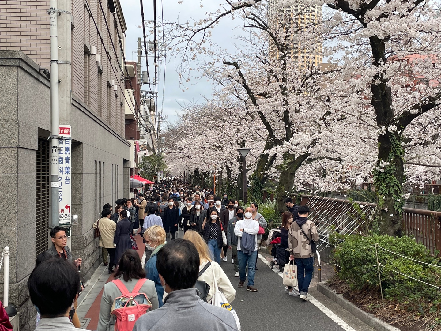 메구로강 양 옆으로 벚꽃이 펴 있는 게 참 예쁘네요. 이케지리 오하시 역에서부터 메구로 역까지 대략 4km에 걸쳐 800여 그루의 벚꽃 나무가 있다고 합니다. 또, 밤이면 점등 행사도 하는데 2022년에는 코로나의 영향으로 하지 않는다고 하네요. 이게 참 절경인 것 같은데 아쉽네요.